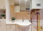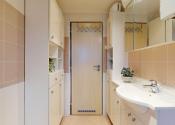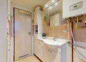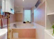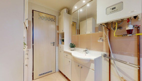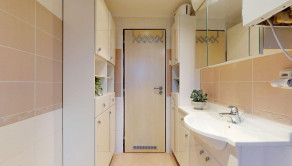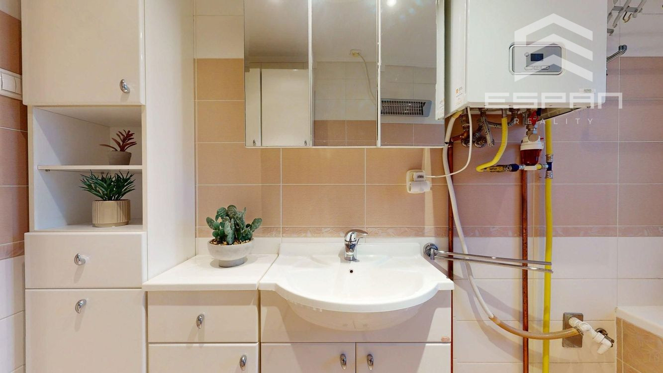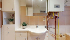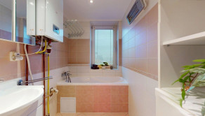 V kúpeľni bytu sa nachádza umývadlo, kúpeľňový nábytok a vaňa.