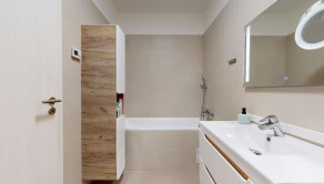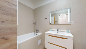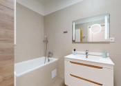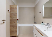 Kúpeľňa bytu je komfortne vybavená pre bývanie páru alebo viacčlennej rodiny.