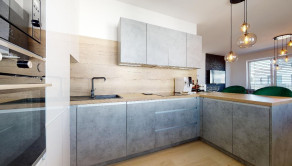 Na mieru vyrobená kuchynská linka je prepojená s jedálenským ostrovčekom a je kompletne vybavená spotrebičmi, a to: indukčnou varnou doskou, teplovzdušnou elektr. rúrou, digestorom, umývačkou riadu a chladničkou s mrazákom.