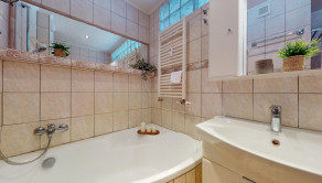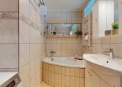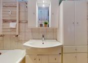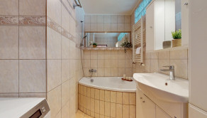Kúpeľňa bytu je vybavená práčkou, rohovou vaňou a kúpeľňovým nábytkom.
