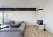 V obývačke je osadený aj krb s vkusnou úpravou maľovky - tz. benátskej štuky.