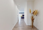 Ďalej sa cez chodbu prechádza do kuchyne, ktorá má vlastnú zabudovanú špajzu. Obývačka s kuchyňou sú navzájom prepojené miestnosti.