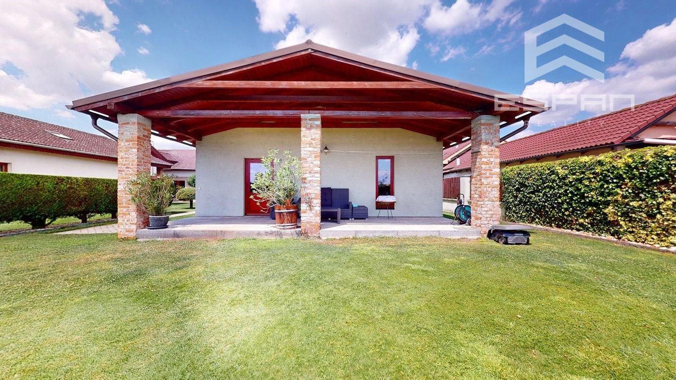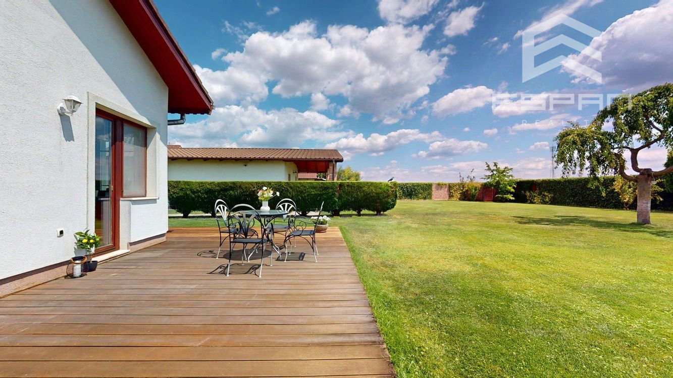 Samostatná garáž nachádzajúca sa na pozemku má taktiež svoju vlastnú prekrytú terasu s príjemným sedením a výľadom na záhradu domu.