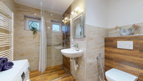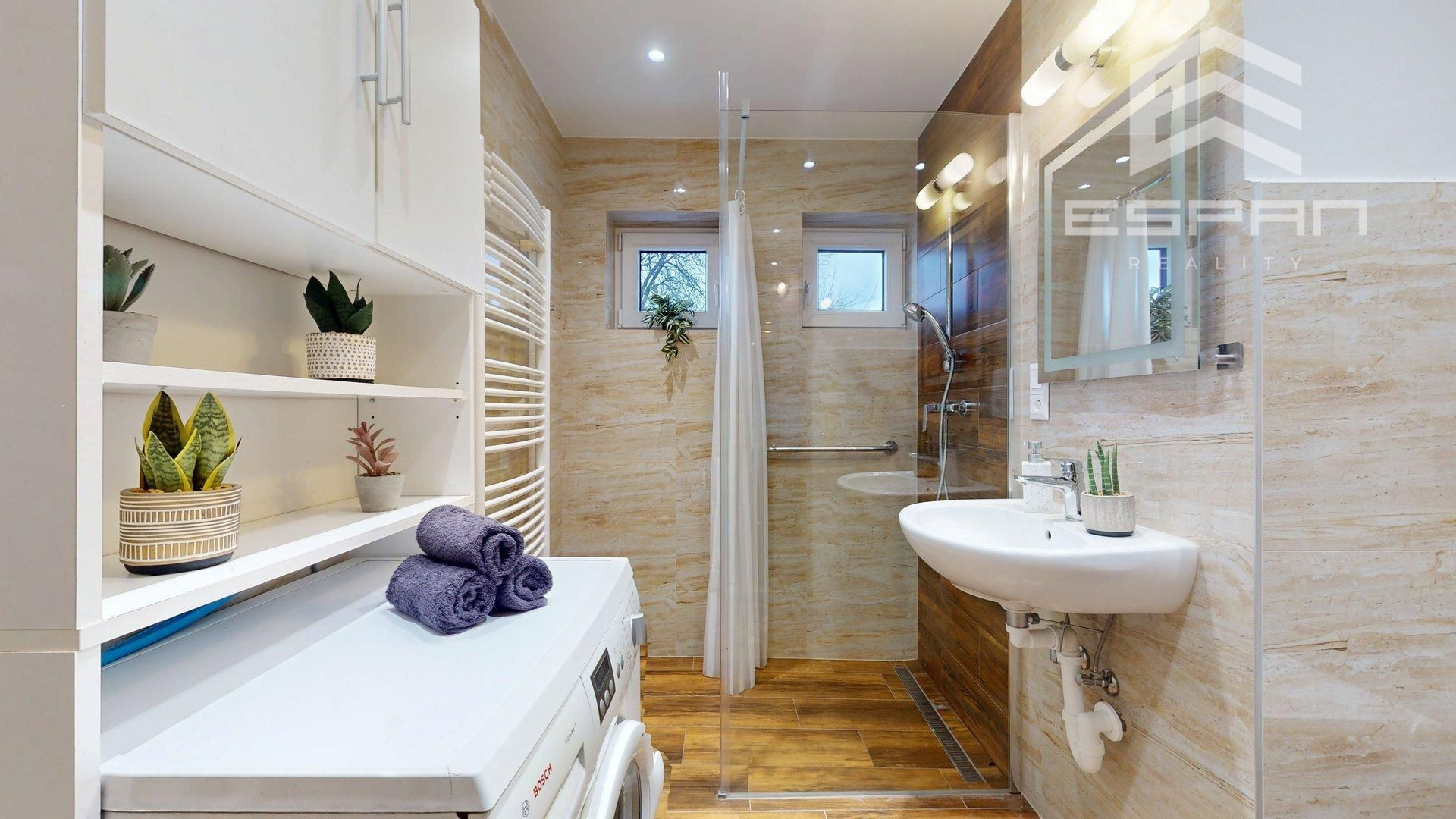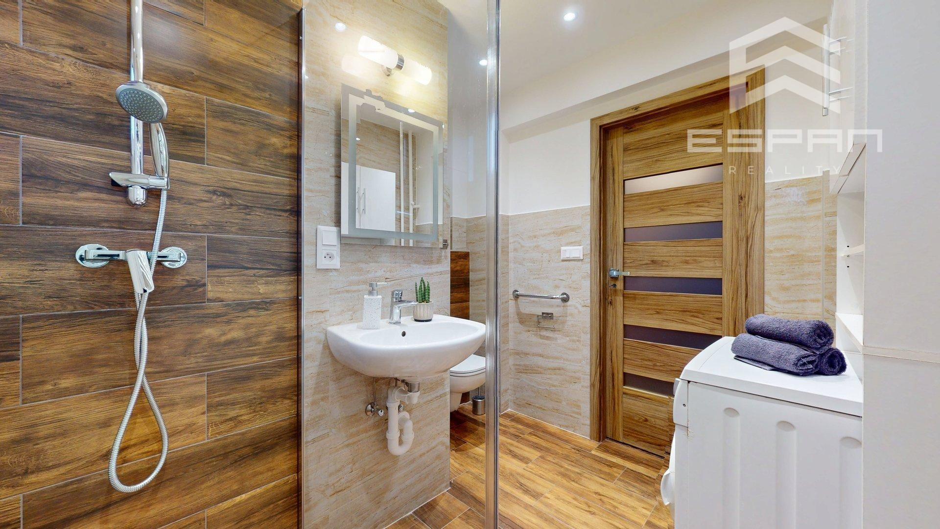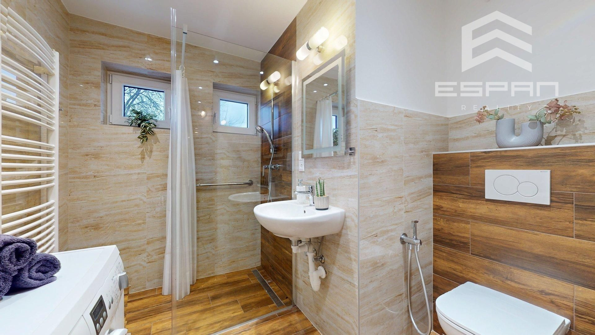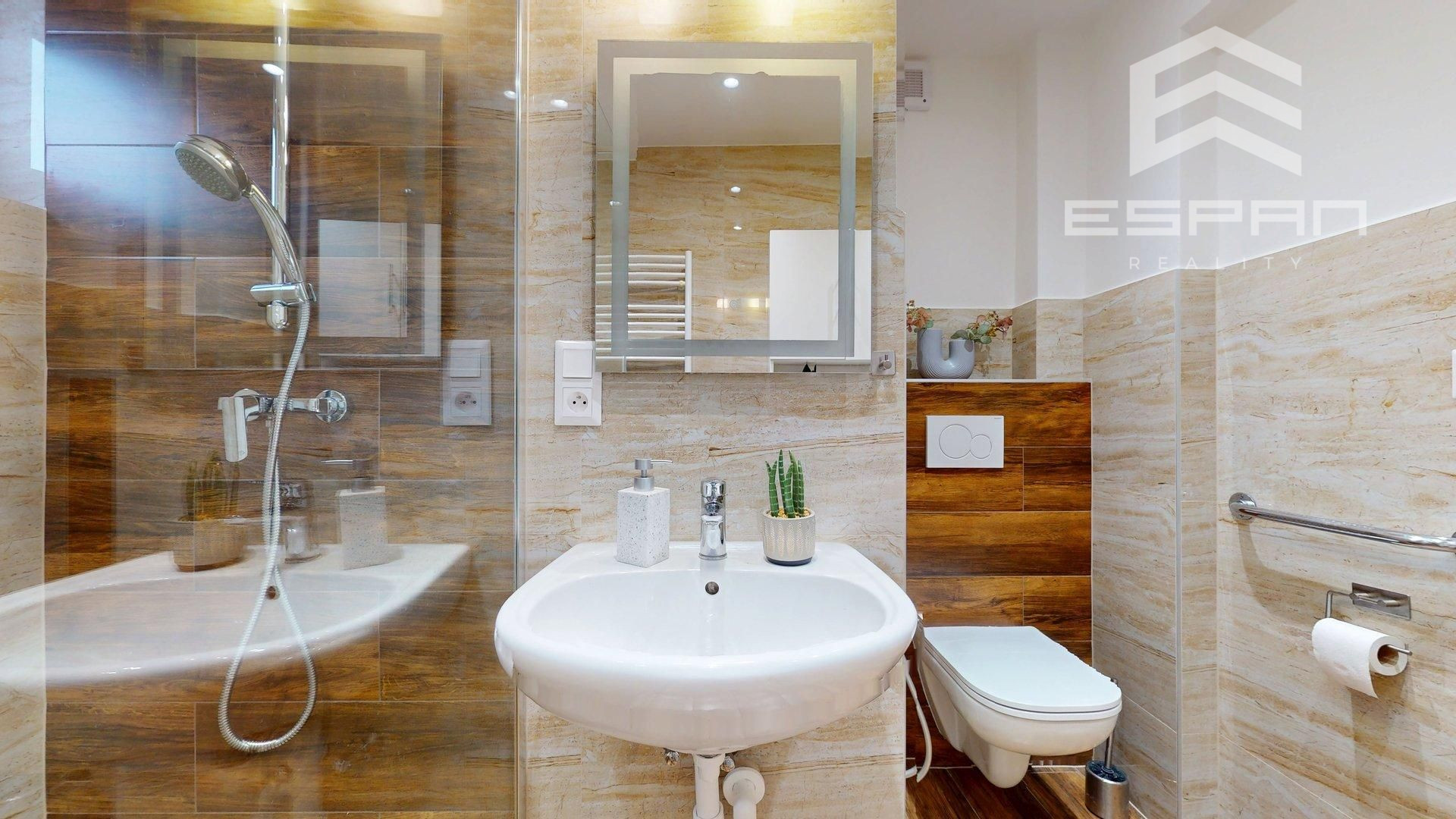 Kúpeľňa bytu je kompletne zrekonštruovaná.