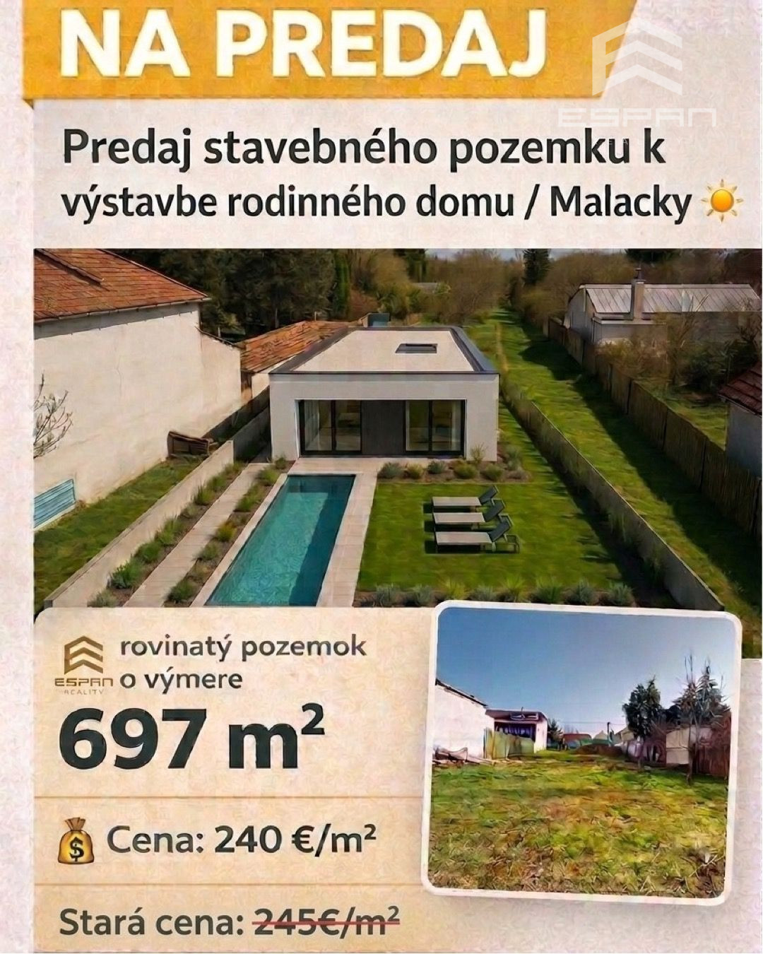 Ponúkame Vám na predaj veľkorysý STAVEBNÝ POZEMOK určený na výstavbu rodinného domu o výmere 697 m2 v zastavanej časti mesta Malacky, časť Riadok.
