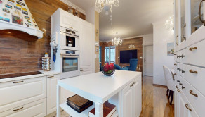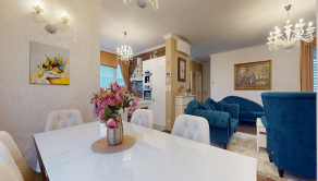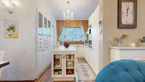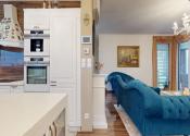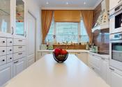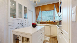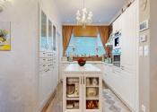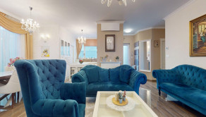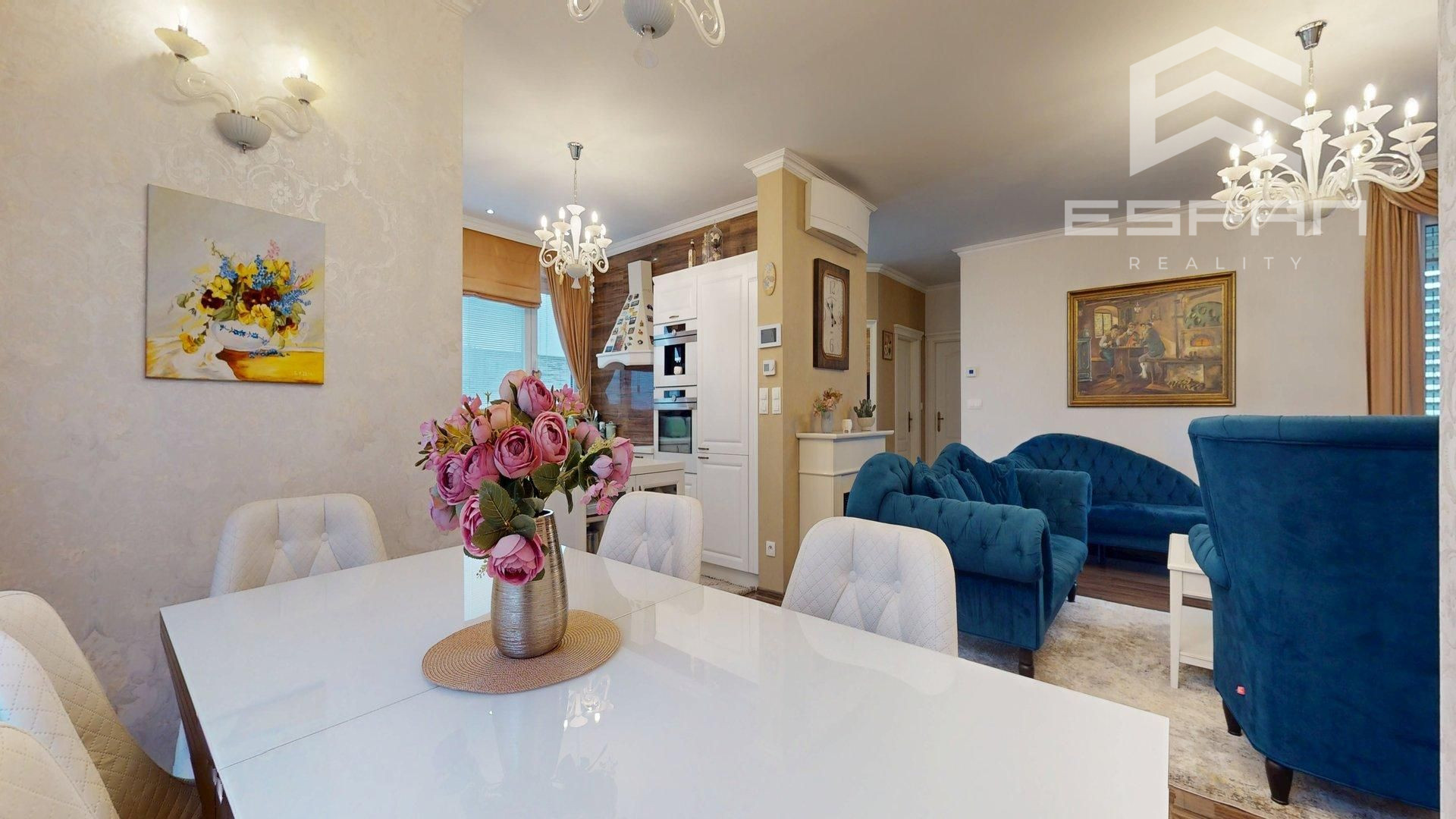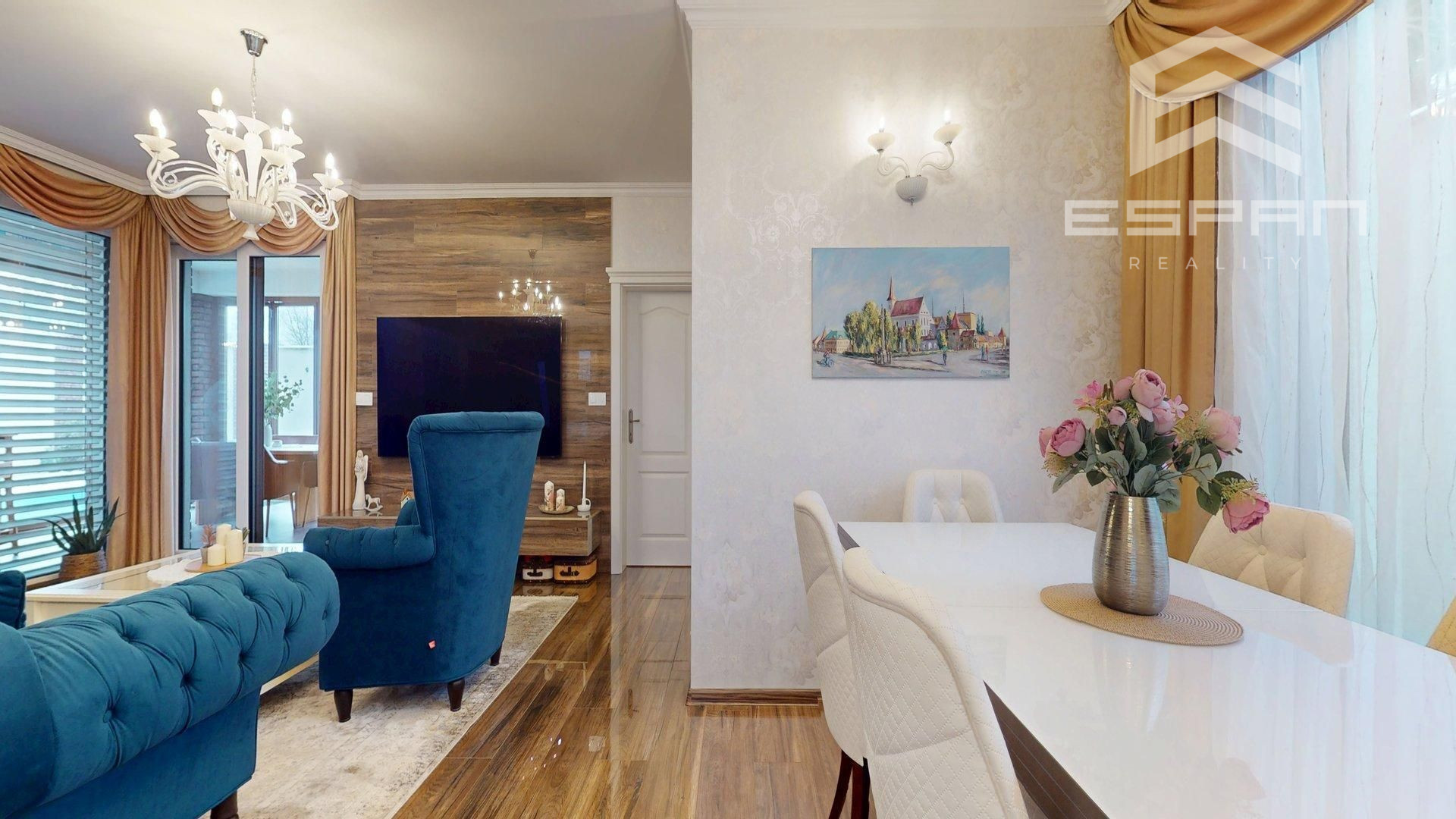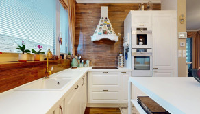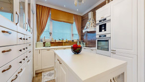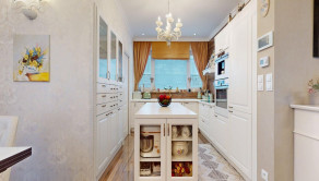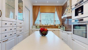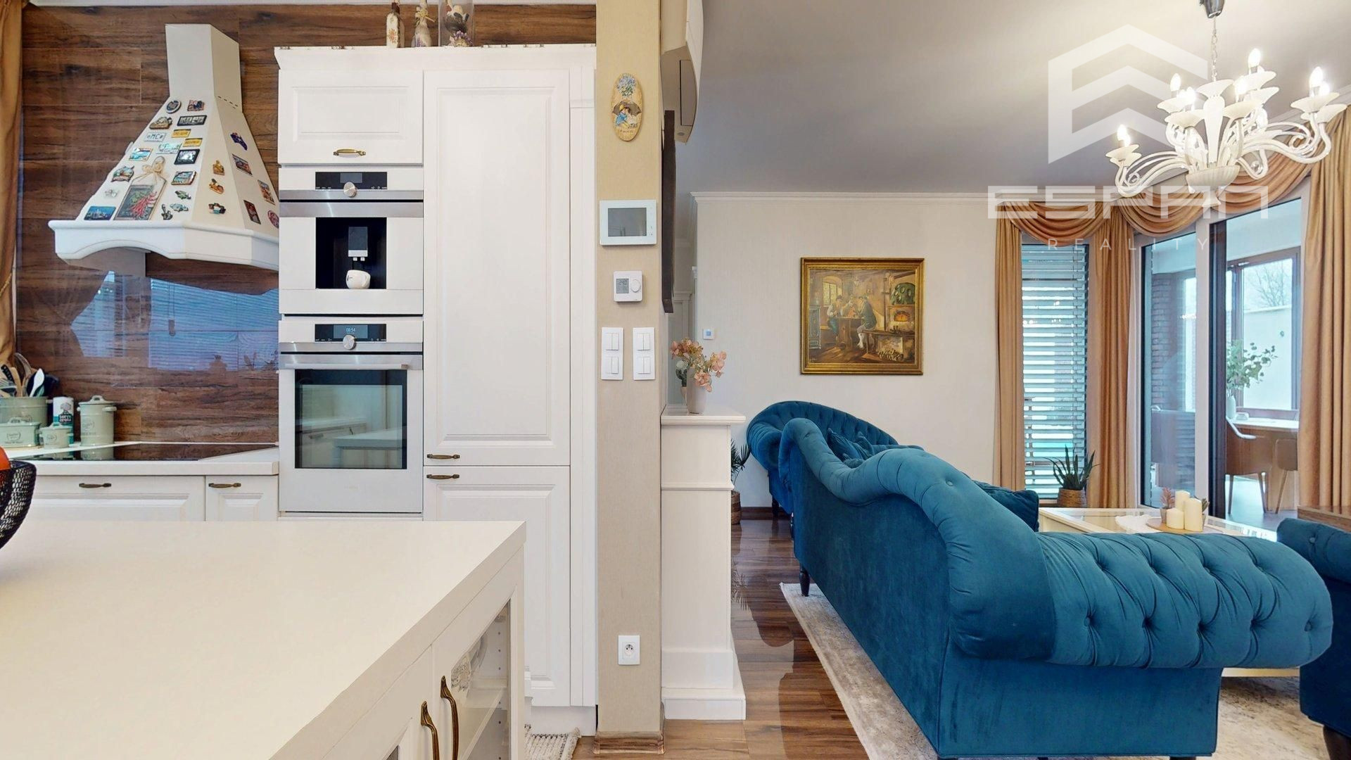 Otvorená dispozícia vstupnej haly, ktorá pokračuje do priestrannej obývačky prepojenej s nadštandardnou kuchyňou vytvára dojem vkusne zariadeného obytného priestoru.