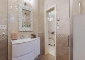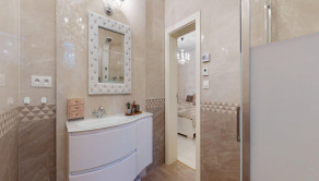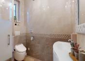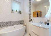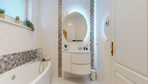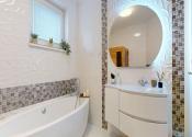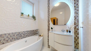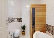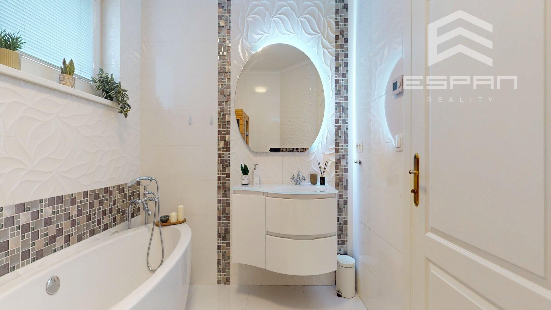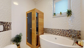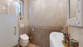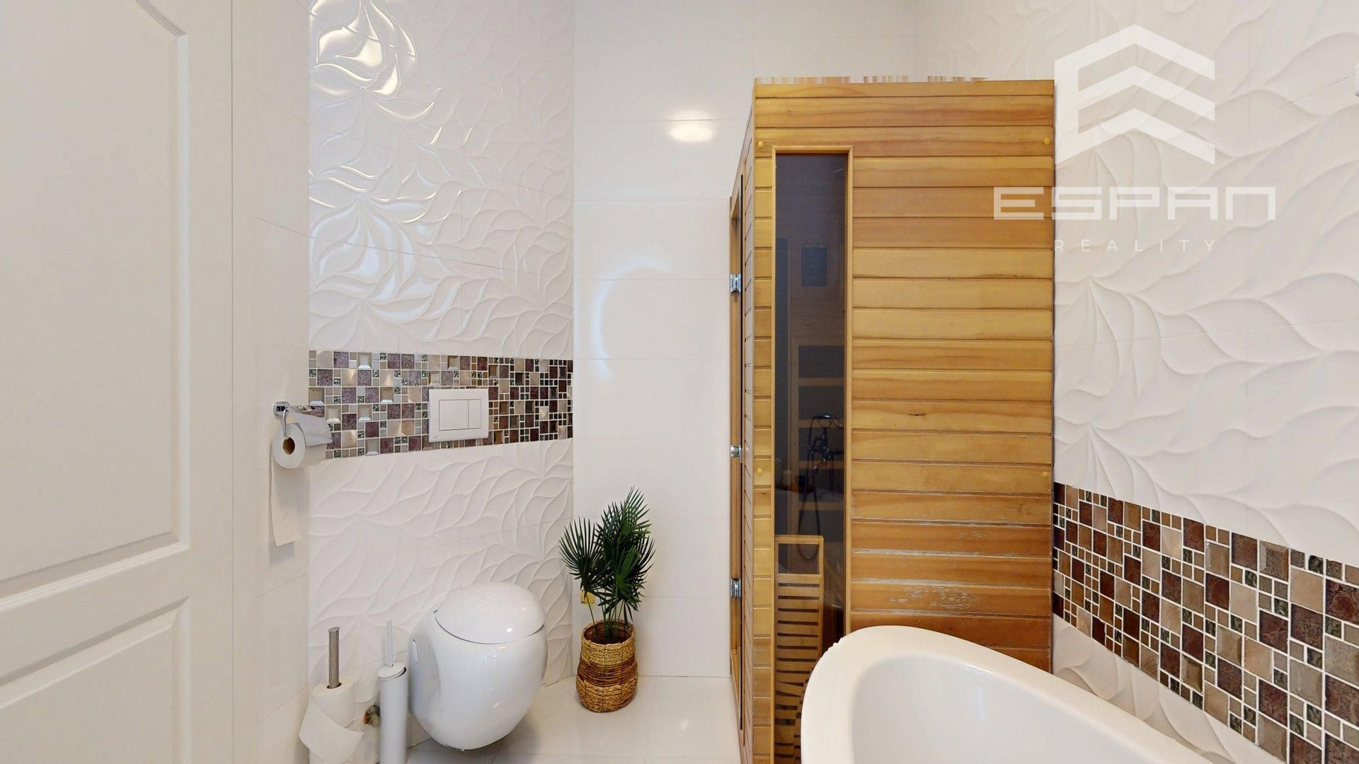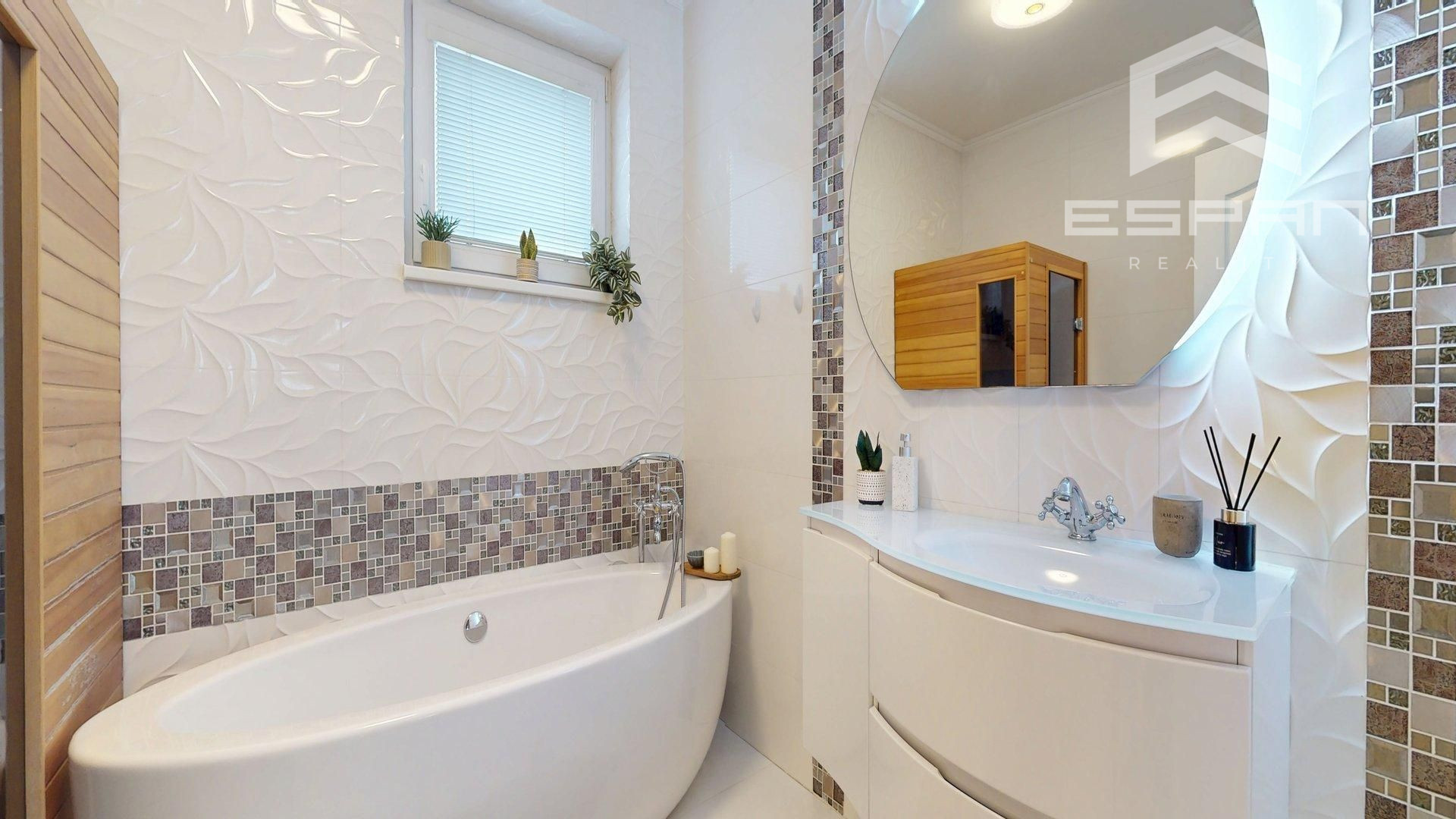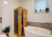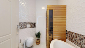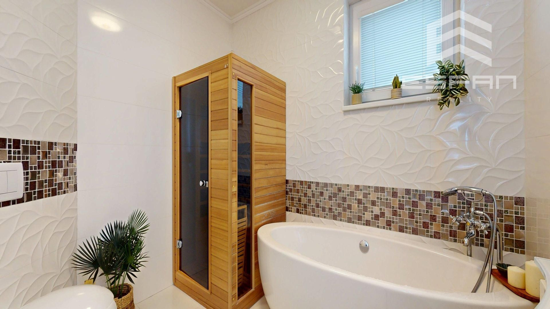 Hlavná kúpeľňa sa nachádza v blízkosti všetkých 3 izieb, je vybavená vaňou, toaletou aj saunou.