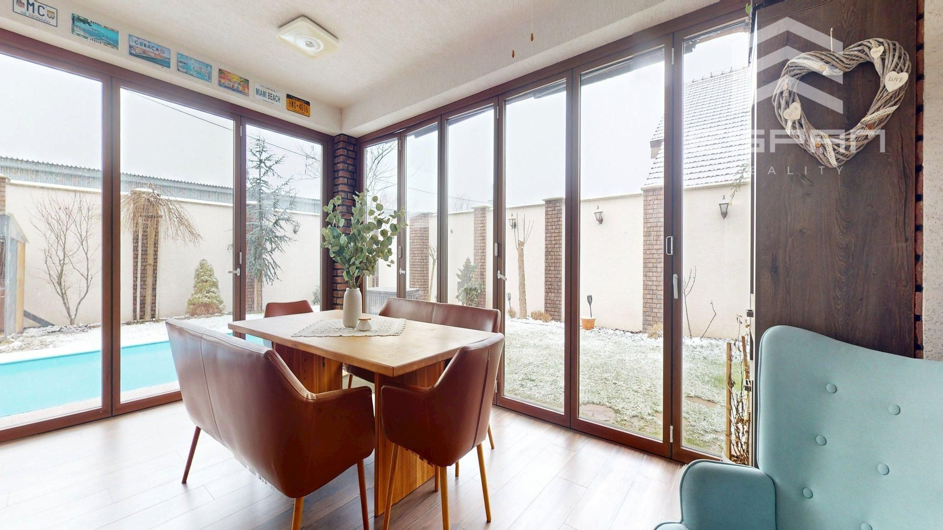Dom ponúka veľmi príjemné rodinné zázemie s kompletným vybavením domu, vrátane parkovania na 2 autá, bazénu a presklenenej terasy.