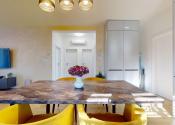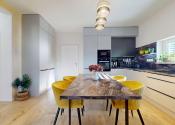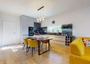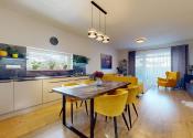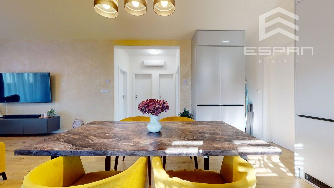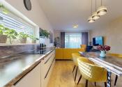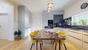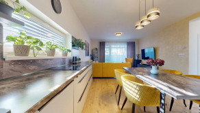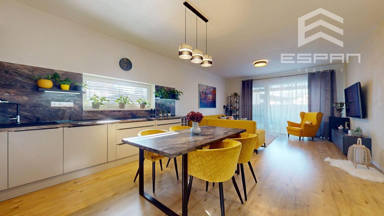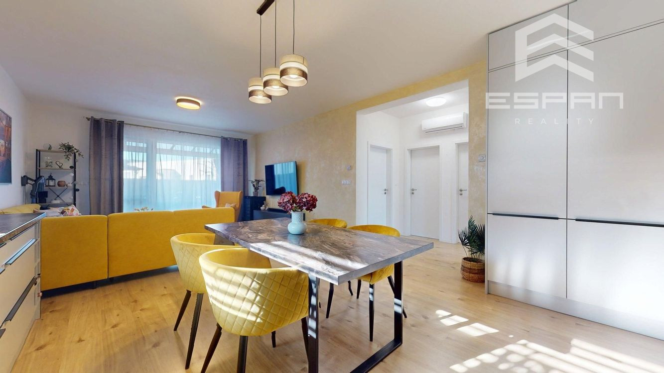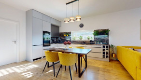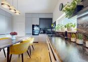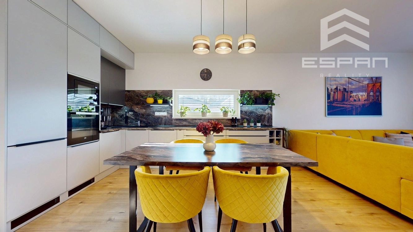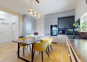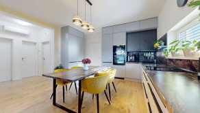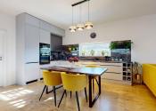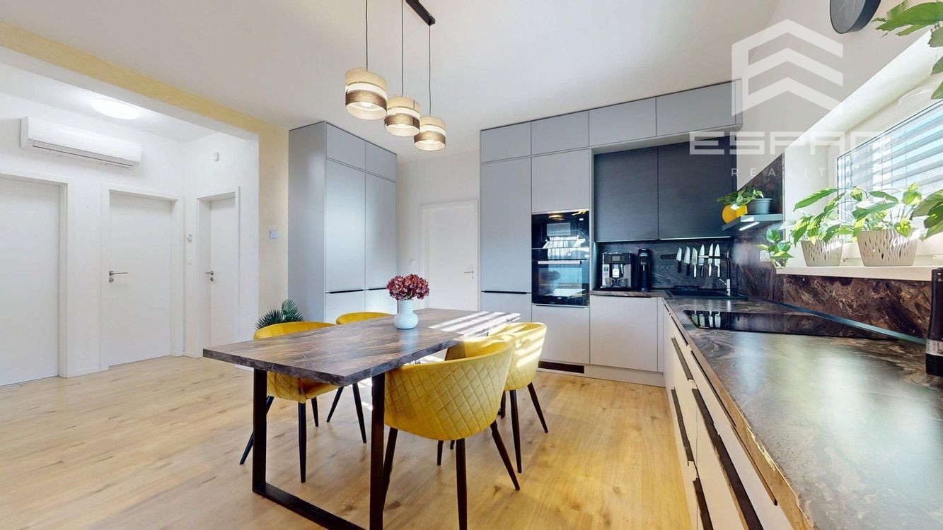 Kuchynská linka je kompletne vybavená modernými vstavanými spotrebičmi a je doplnená solitérnym jedálenským stolom so stoličkami.