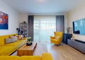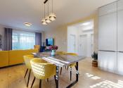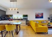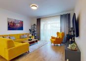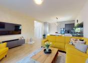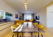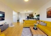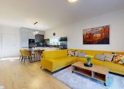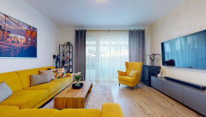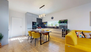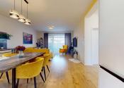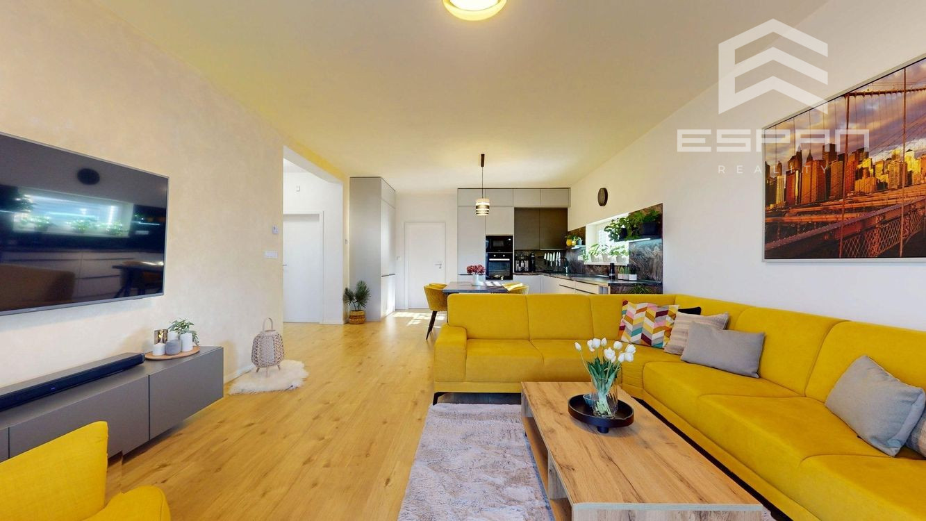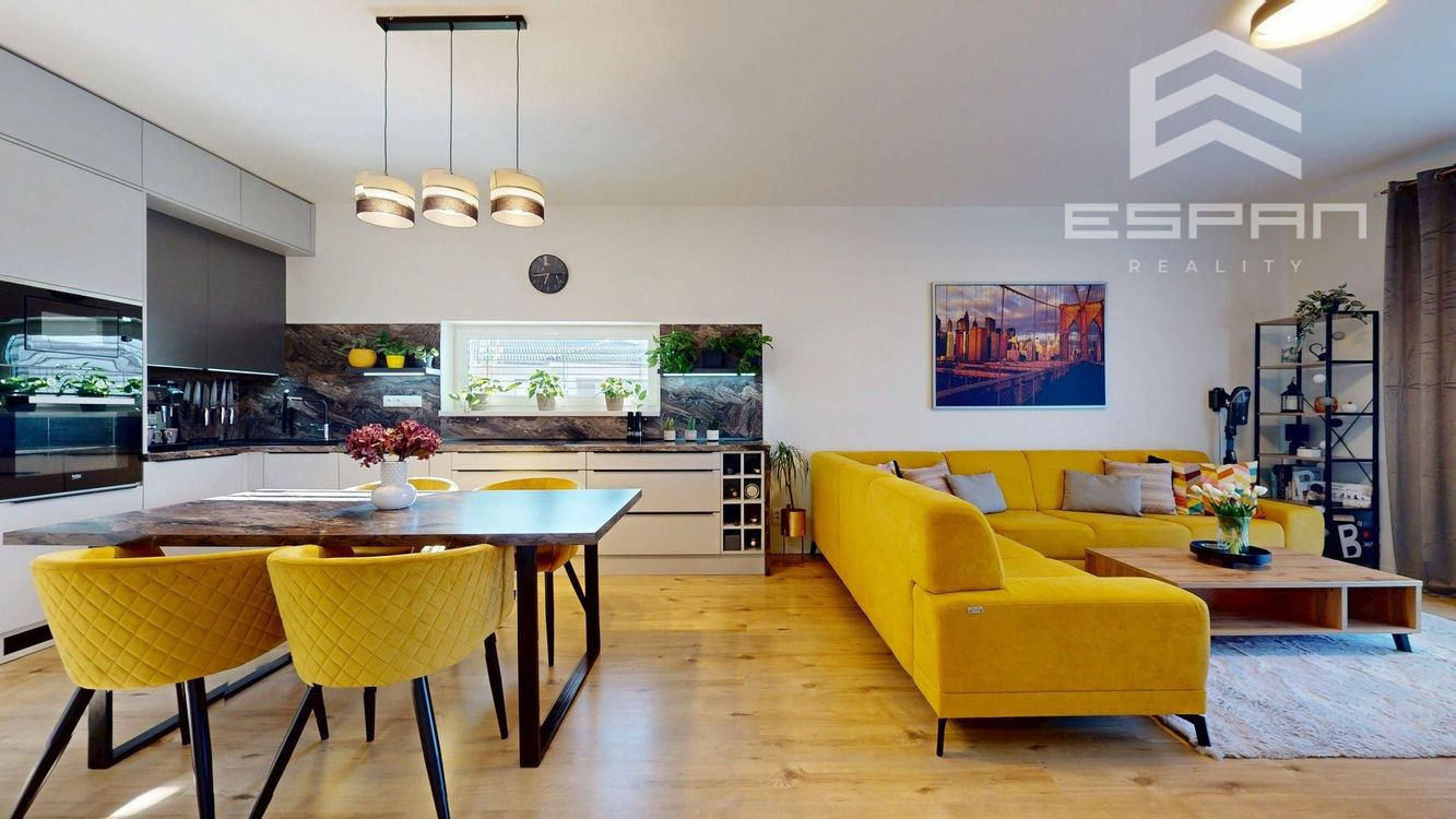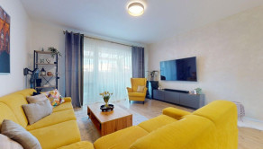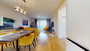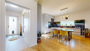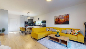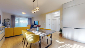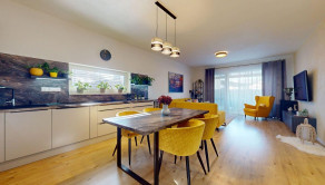 Do bytu sa vchádza cez vstupnú predsieň, cez ktorú sa ďalej prechádza do modernej obývačky prepojenej s na mieru vyrobenou kuchynskou linkou.