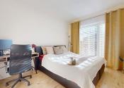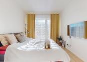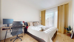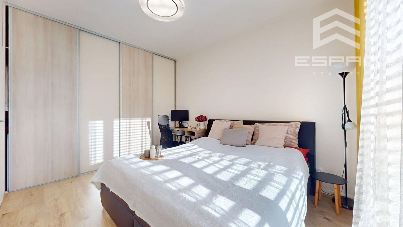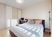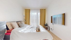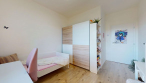 Spálňa v byte je priestranná a je vybavená manželskou posteľou a vstavanou šatníkovou skriňou.