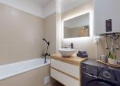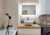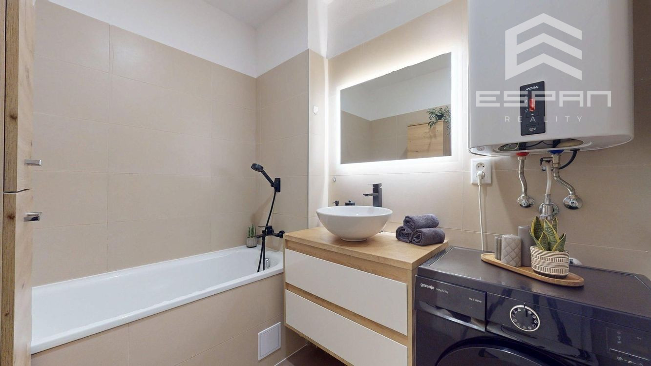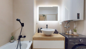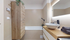 Kúpeľňa bytu je vybavená vaňou a vkusným kúpelňovým nábytkom.