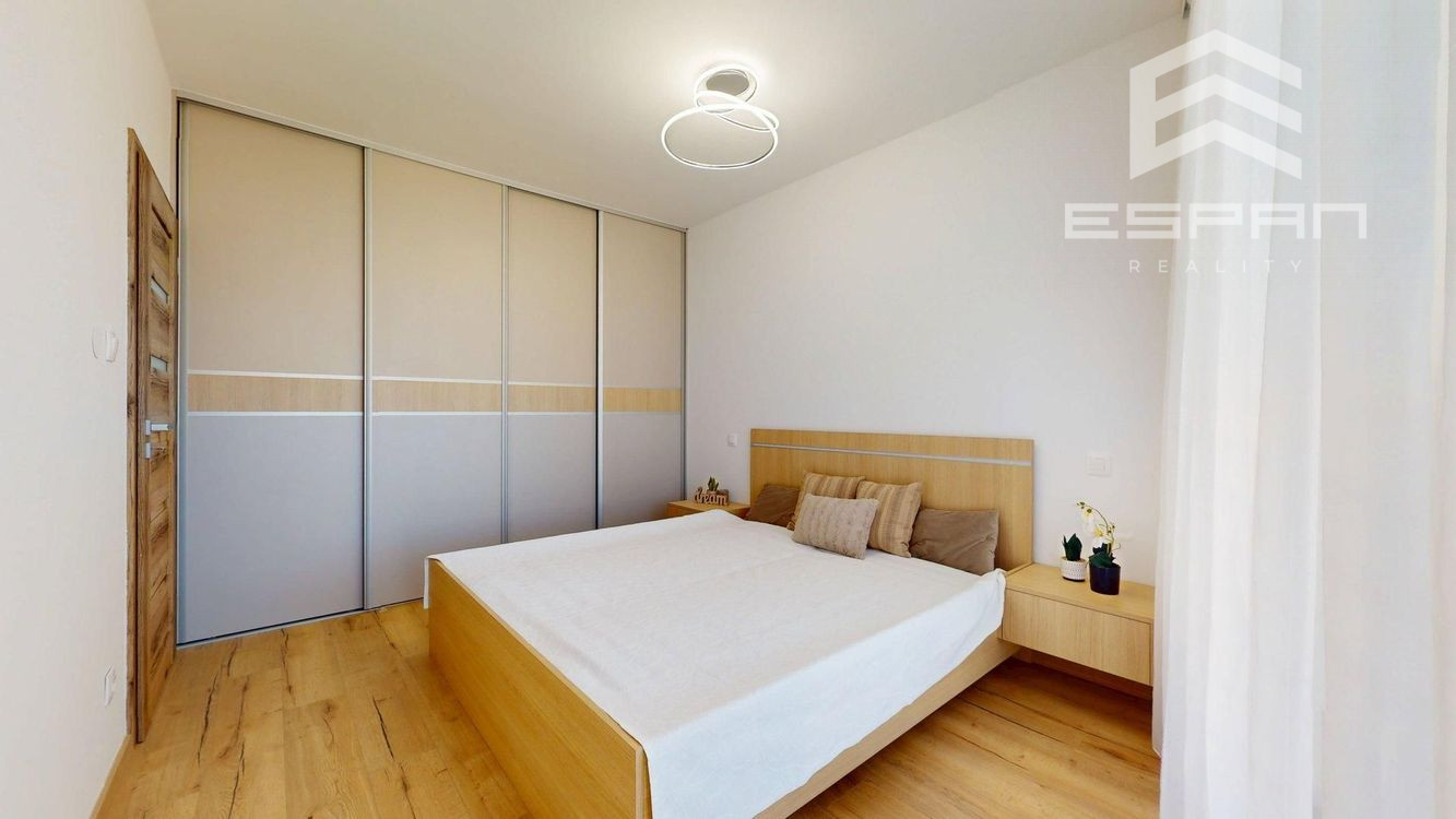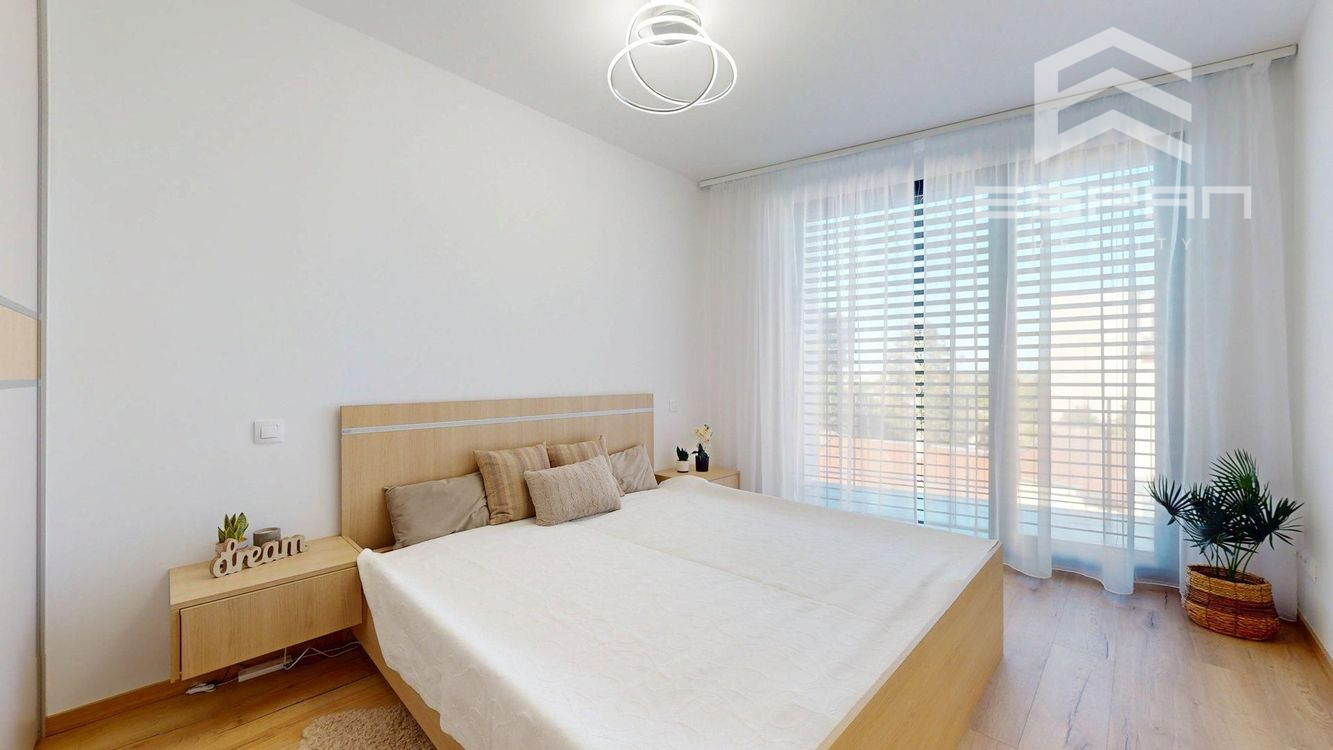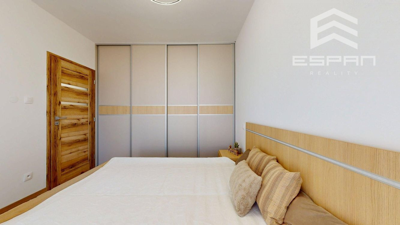 Spálňa je zariadená vstavanou šatníkovou skriňou, na mieru vyrobenou manželskou posteľou s osvetlením a príručnými stolíkmi.