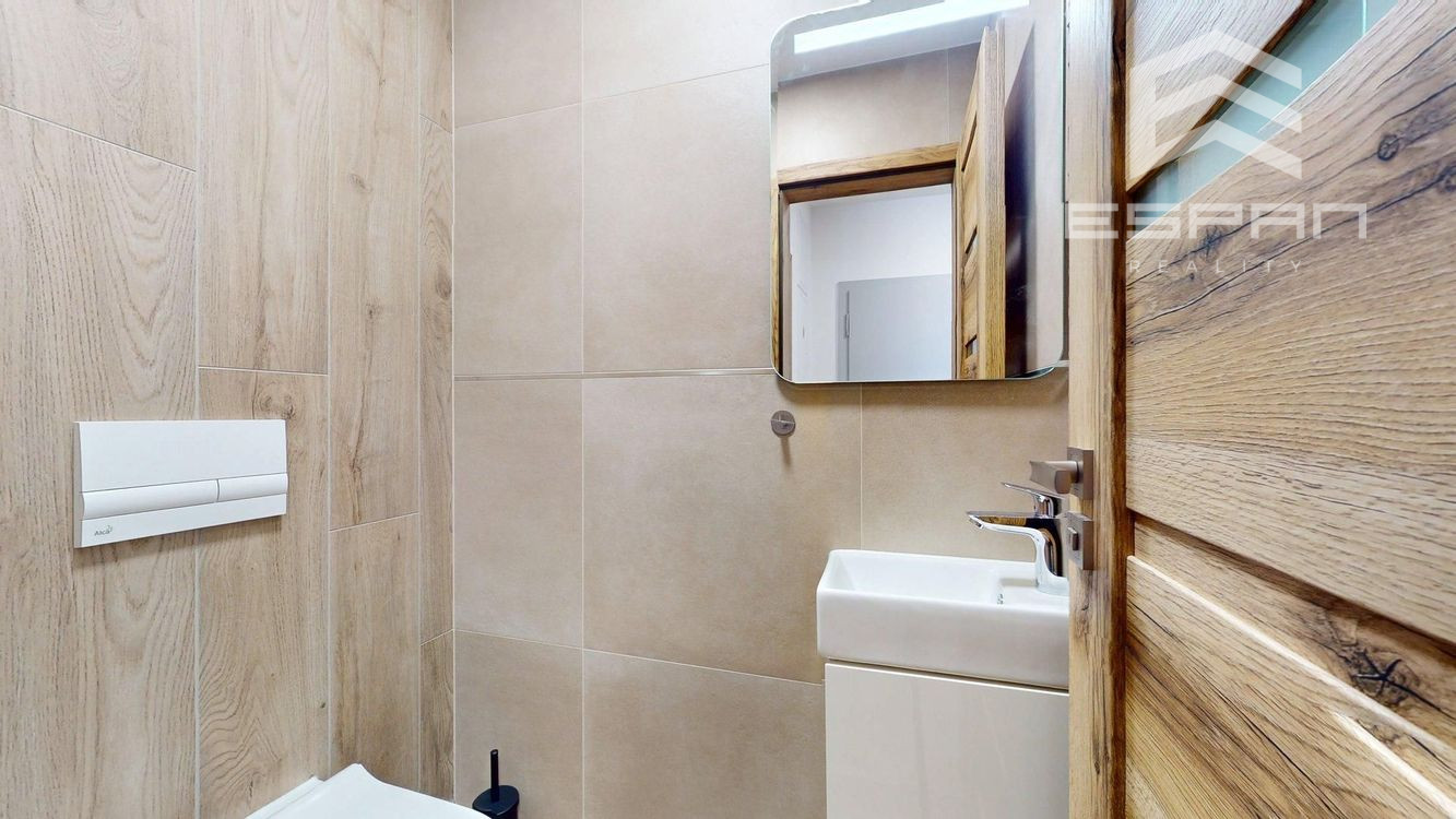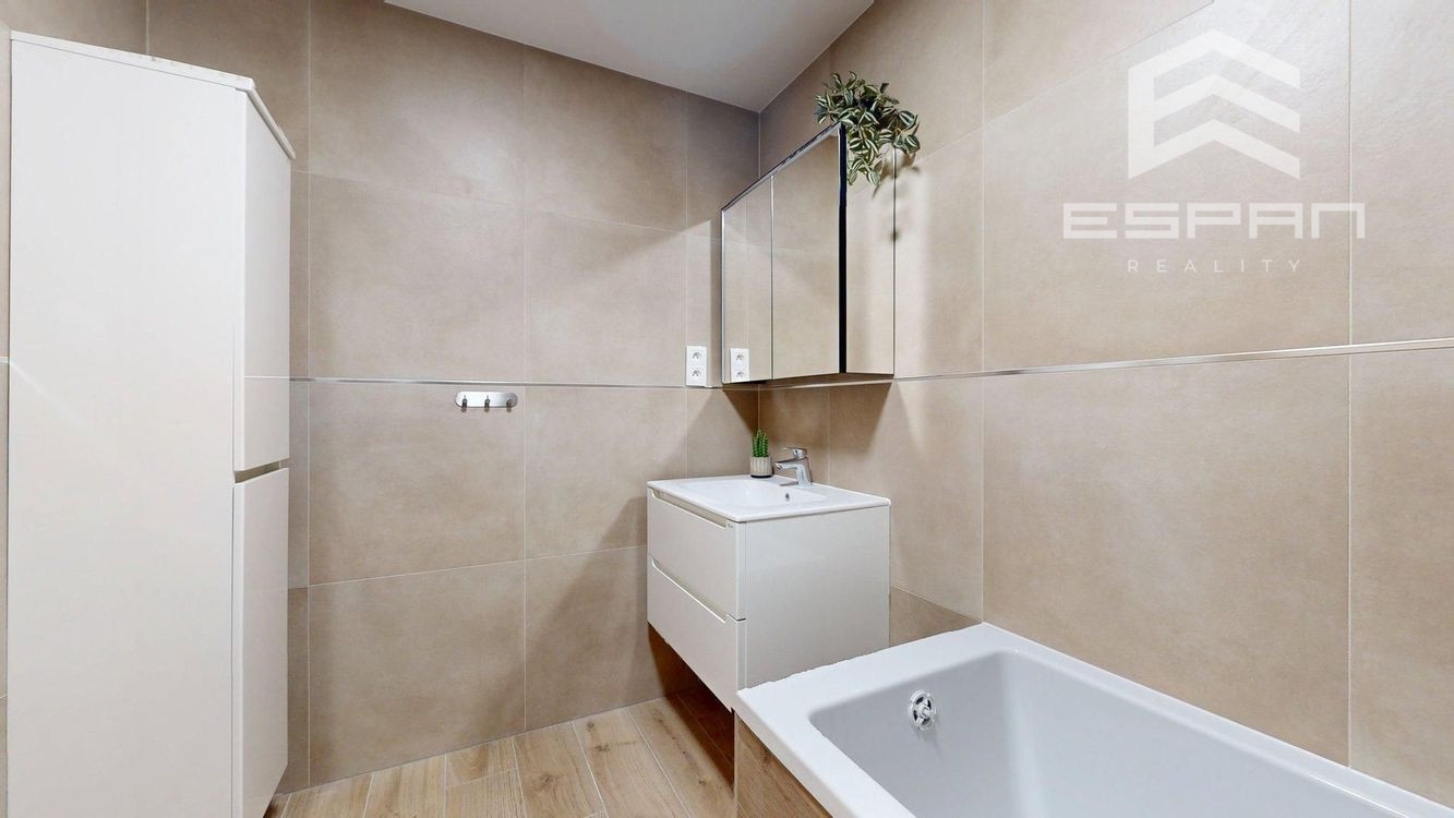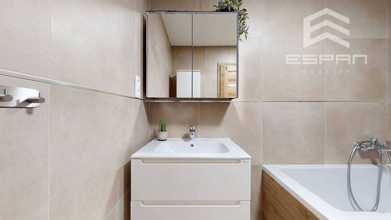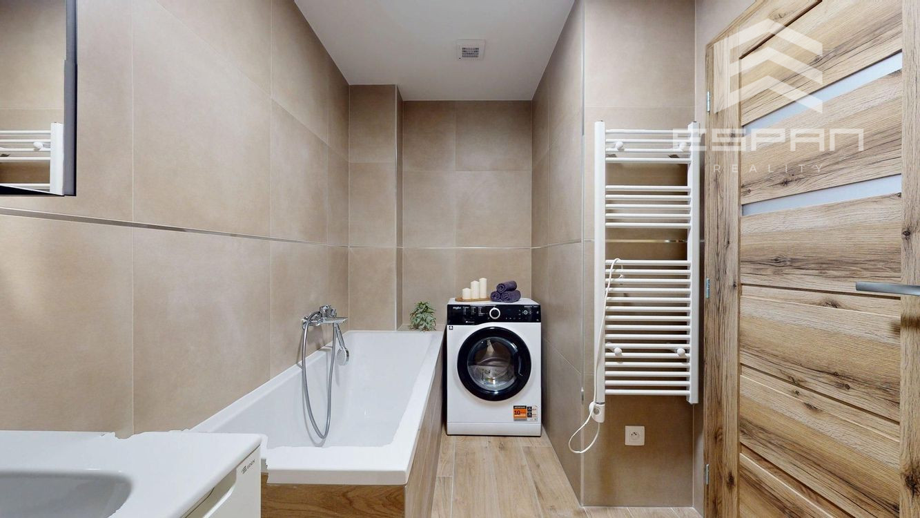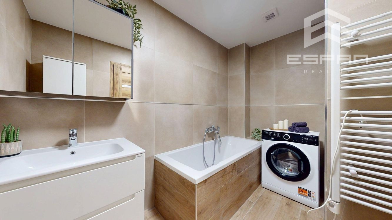 V kúpeľni sa nachádza umývadlo s kúpeľňovým nábytkom, vaňa aj práčka.