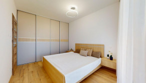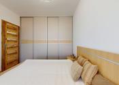 Spálňa je zariadená vstavanou šatníkovou skriňou, na mieru vyrobenou manželskou posteľou s osvetlením a príručnými stolíkmi.