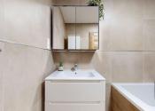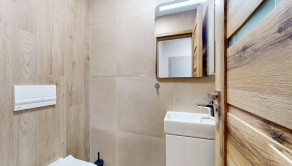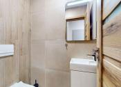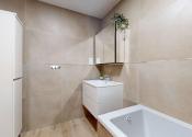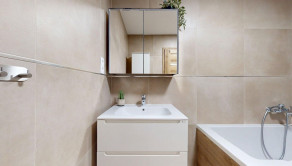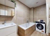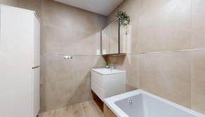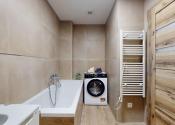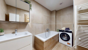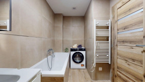 V kúpeľni sa nachádza umývadlo s kúpeľňovým nábytkom, vaňa aj práčka.